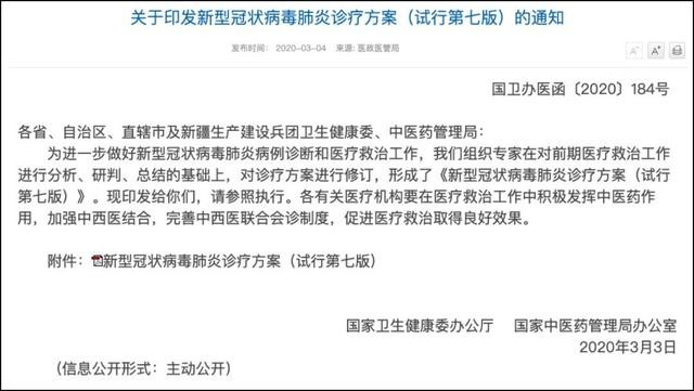 国家卫生健康委员会发布了《新型冠状病毒肺炎诊疗方案(试行第七版)》