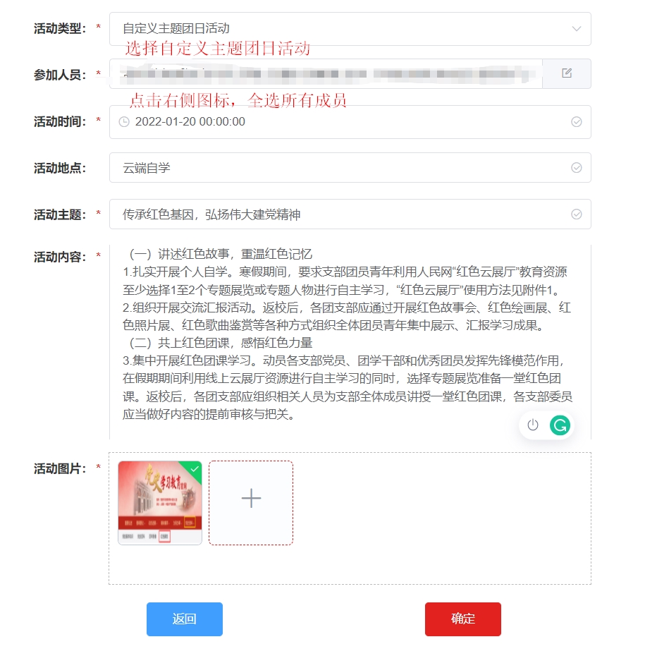 4.点击确定发布成功后,团员即可登陆智慧团建系统查看团日活动内容。