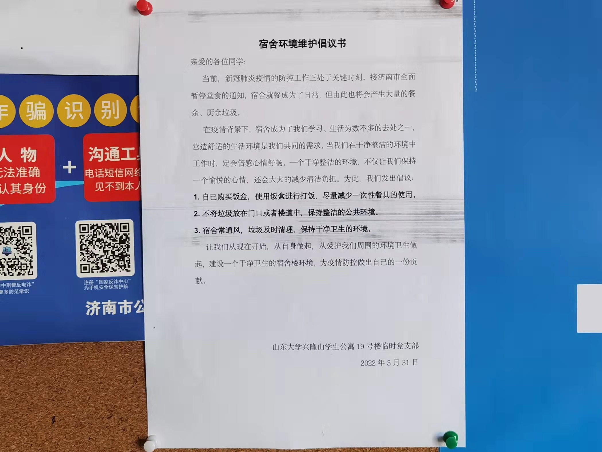 辅导员刘慧慧老师、临时党支部书记能动学院学生张友浩同志迅速反映,第一时间与宿管徐日慧老师沟通联系,了解诉求。得知部分宿管、保洁老师不能到岗的情况,为协助宿舍阿姨做好19号楼相关工作,支部于3月31日下午向19号楼内同学们分发《宿舍环境维护倡议书》,线上线下相结合做到楼内同学全覆盖,呼吁同学们从自身做起,建设宜居的公寓环境,为疫情封控贡献自己的力量。