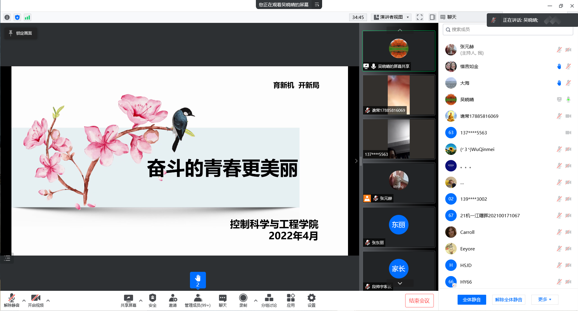 张元赫首先介绍和传达了学校近期的防疫政策、要求和措施,学院秉持“筑牢疫情防控战线,为学生安全学习生活保驾护航”的理念,从校园严格封控、学校纪律、学校物资储备、线下授课提升教学质量等方面协同发力。学院留校教师和学工队伍心系学生,时刻紧密联系同学,筑牢安全保护网,思学生所思,想同学所想,做好后勤保障与心理疏导工作,共同打赢这场疫情“保卫战”。随后张元赫就学生的学业情况和心理健康情况进行汇报,倡议建立“家长—辅导员”双向沟通渠道。最后从“四个安全”展开,强调疫情安全、宿舍安全、交通安全、网络安全相关注意事项与行为倡议,切实保障学生安全。