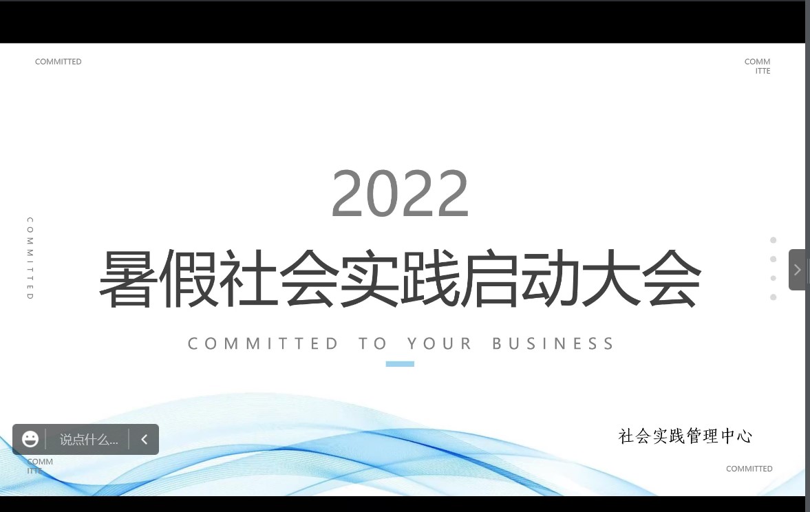 对社会实践要求及暑假社会实践的安全管理进行发言,她强调,社会实践的开展要结合疫情防控政策,不前往中高风险地区线下实践;社会实践队伍与安全负责人和宣传负责人建立“一对一”有效对接,保证各实践队伍活动的实时追踪,做好安全预防和活动宣传工作;实践活动要结合实际情况创新实践形式,鼓励“云调研”、“云访谈”等新形式,鼓励线下线上联动拓展实践形式。