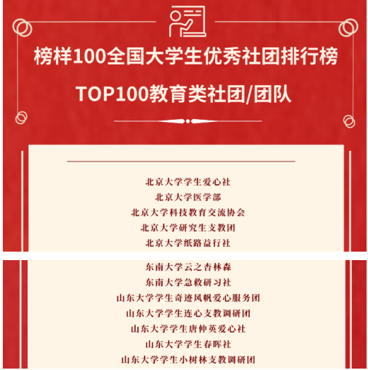 指导的两支学生社团入围,山东大学学生电子设计协会入选TOP100学术类社团,山东大学学生连心支教调研团入选TOP100教育类社团。