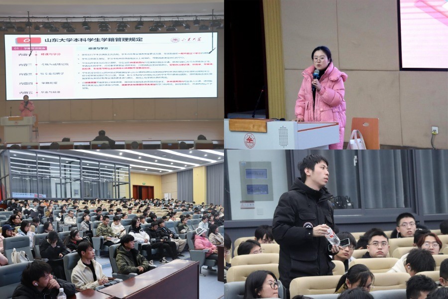 讲座伊始,孙亚对《山东大学本科学生学籍管理规定》进行深度解读,确保教学工作的规范性和严谨性。她解读了本科人才培养方案的构成体系和指导作用,阐述了关键内容,重点围绕学生选课的常见问题与毕业审核要求等方面展开系统讲解,并指出重要时间节点和事项,特别是毕业生要把握重点,提前规划,加强学术诚信。在选课常见问题阶段,孙亚介绍了选课流程,帮助同学们规避选课误区,轻松、高效地完成选课。针对选课流程中的核心环节作出重点提醒,孙亚强调需严格参照班级课表选择必修课程,提醒学生注意课程代码一致性及重修课程属性修改等细节,防止出现选择同名课程但不同编号导致无法毕业的现象。在毕业审核要求阶段,她特别指出除明确学分、绩点、体测等硬性指标外,“稷下创新”“齐鲁创业”等特色课程以及人文、国学等相关课程也有相应的学分要求。最后孙亚根据毕业审核所遇到的常见问题,例如,毕业时间节点、任选课程学分的补修等内容进行了详细解答。