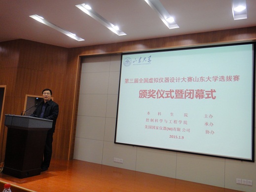 作为学校十个科技创新平台建设单位之一,在校园科技竞赛活动方面做出的突出成绩表示赞赏。他表示本科生院会加大校级科技创新平台的投入,把校园科技实践活动继续向前推进。最后,他希望本次比赛的获奖选手戒骄戒躁再接再厉,以更加优秀的作品和良好的精神面貌去迎接国家级比赛的挑战,并预祝他们取得好成绩。会上,高瑞教授作为组委会执行主席介绍了比赛的组织和评奖情况,张振山副书记宣读了本次比赛的获奖名单,美国国家仪器公司山东区域经理张立军工程师代表协办单位讲话。
