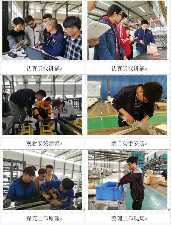 除了参观学习,实际动手操作也是本次实习的重点。同学们被分为四个实习小组,分别由企业人员带领参与到不同的项目中体验并学习相关设备的安装。同学们在自己的岗位上按照企业生产工艺流程和标准进行动手操作,不同的实习小组分别动手安装了通道机线缆、超级电容穿梭车悬挂设备和麦克纳姆轮等。此外同学们还进行了6S管理的体验。在动手操作的过程中,同学们体会到了劳动的不易,对企业优化安装流程的措施和管理方法有了更深刻的感受。每天实习结束后,同学们都会同企业人员一起针对自己的收获进行交流学习,以巩固当天所学的知识。