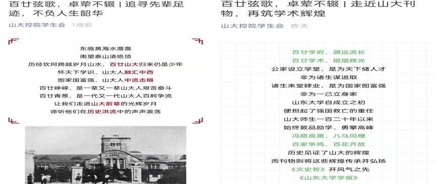 以山大控院学生会公众号为载体,开设了“百廿弦歌,卓荦不辍”、“控山心语home”、“兴隆山下”等线上美育版块,搭建更多更好的自我学习平台,以文字形式普及人文艺术等美育知识,在理工氛围浓厚的兴隆山不忘提升人文素养,激发和满足工科学生的兴趣。紧跟时事,推出百廿专题等栏目,进一步宣扬校史、党史知识,培养同学们的爱党、爱国、爱校情怀。线上线下并举,取得显著成效。
