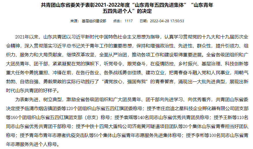 近日,共青团山东省委公布了《共青团山东省委关于表彰2021-2022年度“山东青年五四先进集体”“山东青年五四先进个人”的决定》 ,360足球直播比分