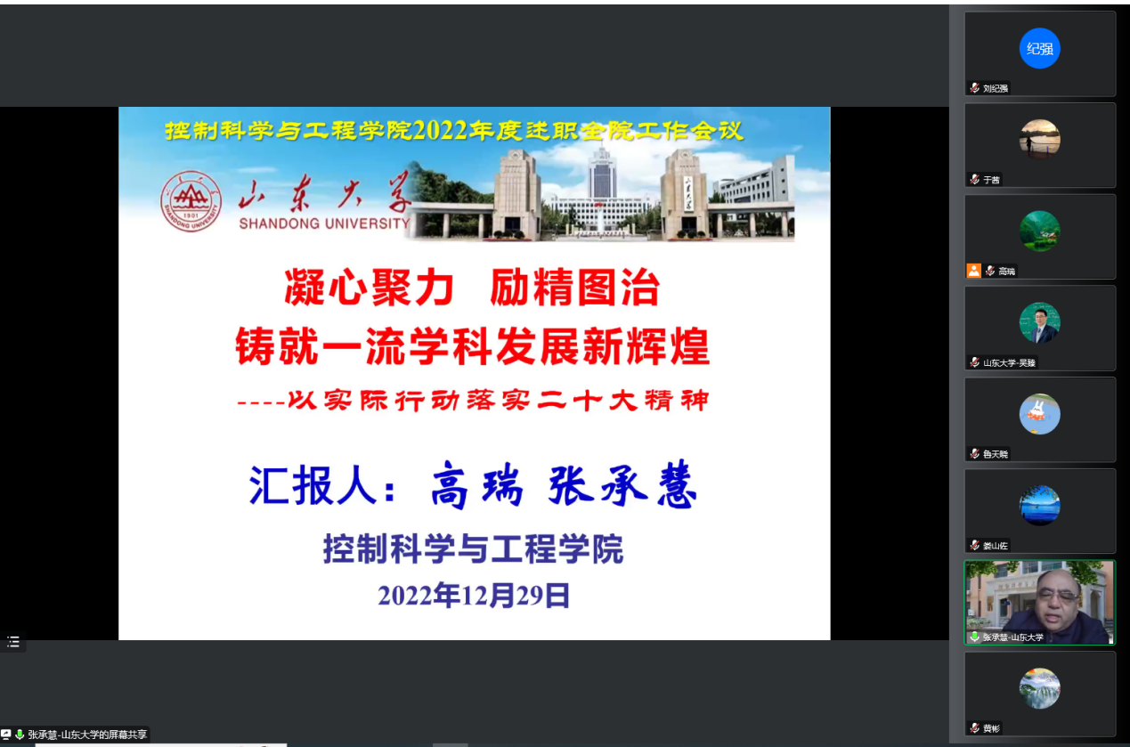 2022年述职报告,围绕2022年度工作进展、建设任务与完成进度、奋斗目标与未来愿景等三个部分对学院事业发展进行了系统总结,谋划了下一步工作布局。张承慧表示,学院2022-2025任务目标按阶段/超前完成,学院各项事业再上新台阶。党建引领积蓄新动能,获评“山东省五四红旗团委”、山东大学“优秀基层教学组织”。杰出人才引育彰显新高度,新增国家杰青1人(高峰)、国家四青人才7人,其中国家优青2人、海外优青4人(均占全校的1/6)、青年拔尖1人,再创学院国家级人才增量历史新高;新增IEEE Fellow、ESI全球“高被引科学家”各1人、泰山学者青年专家6人。国家级人才增量/总量位居全校第一、全国同类学院学科前列。国际合作实现新跨越,获批2023年高校创新引智基地,为全校唯一。立德树人取得新成果,打造国家级一流专业全覆盖新格局,获山东省教学成果一等奖3项,获推申报国家级教学成果奖2项,山大教学终身成就奖1项。学科建设跃上新台阶,控制科学与工程学科晋级A类,综合实力名列全国同学科前茅。科学研究再创佳绩,获中国工程院光华工程科技奖和教育部技术发明一等奖各1项;山东省科学技术奖二等奖3项;中国自动化学会自然科学奖一等奖1项、二等奖3项。立项科研经费达1.5亿元/到位经费1.06亿元,暂居各学院之首。他强调,下一步学院将持续深入学习宣传贯彻党的二十大精神,加强组织建设,践行立德树人,强化学科建设,优化科研布局,深化国际合作,持之以恒用好“3D”工作法,为学校“双一流”建设贡献更大的控院力量和控院经验。