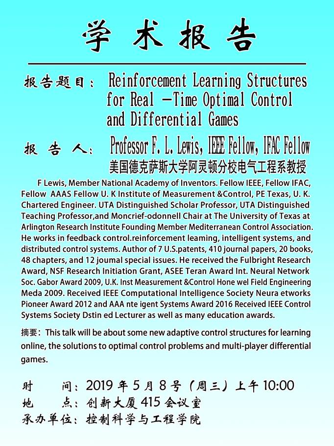 文本框: Abstract:This talk will discuss some new adaptive control structures for learning online the solutions to optimal control problems and multi-player differential games. Techniques from reinforcement learning are used to design a new family of adaptive controllers based on actor-critic mechanisms that converge in real time to optimal control and game theoretic solutions. Continuous-time systems are considered. Application of reinforcement learning to continuous-time (CT) systems has been hampered because the system Hamiltonian contains the full system dynamics. Using our technique known as Integral Reinforcement Learning (IRL), we will develop reinforcement learning methods that do not require knowledge of the system drift dynamics. In the linear quadratic (LQ) case, the new RL adaptive control algorithms learn the solution to the Riccati equation by adaptation along the system motion trajectories. In the case of nonlinear systems with general performance measures, the algorithms learn the (approximate smooth local) solutions of HJ or HJI equations. New algorithms will be presented for solving online the non zero-sum and zero-sum multi-player games. Each player maintains two adaptive learning structures, a critic network and an actor network. The result is an adaptive control system that learns based on the interplay of agents in a game, to deliver true online gaming behavior. A new class of Graphical Games is introduced that takes into account limited information flow in networked systems. A new Experience Replay technique is given that uses past data for present learning and significantly speeds up convergence. New methods of Off-policy Learning allow learning of optimal solutions without knowing any dynamic information. New RL methods in Optimal Tracking allow solution of the Output Regulator Equations for heterogeneous multi-agent systems.