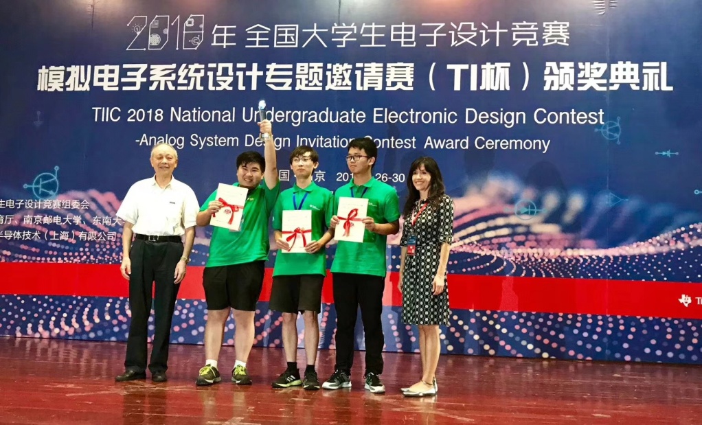 2015级本科生王笑涵和2016级本科生李效霖、从政组成的队伍凭借杰出作品《数字多用表》新颖的构思及优异的性能指标脱颖而出,获得本届邀请赛最高奖项TI杯。中国科学院郑有炓院士、德州仪器公司全球大学计划市场传媒总监Patty Arellano女士亲自为他们颁奖。本届邀请赛我校参赛队伍的选拔、培训和参赛由学校电工与电子创新设计教育平台牵头组织,控制科学与工程学校负责具体指导和比赛保障。